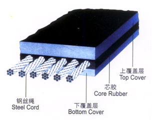 普通結構型鋼絲繩芯輸送帶普通結構鋼絲繩輸送帶特點: 新結構鋼絲繩用作拉伸體。它具有較大的拉伸強度,較小的伸長率,良好的溝槽形成和良好的抗彎曲性。適用于輸送長距離,大容量,高速的物料。 新型結構鋼絲滲透特性 核心橡膠具有足夠的滲透空間進入各股之間。橡膠和鋼絲繩具有高粘接強度,良好的抗腐蝕性能,減輕了股線的剪切和扭曲,并具有優異的抗動態疲勞性。延長產品壽命。