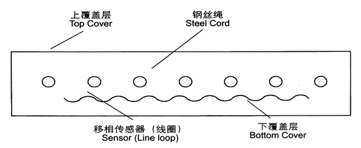 嵌入式線圈防撕裂型 結構體 新結構用作拉伸體。相移傳感器(線圈)沿著縱向方向埋設在鋼絲繩傳送帶的芯橡膠和下覆蓋層之間。 結構示意圖